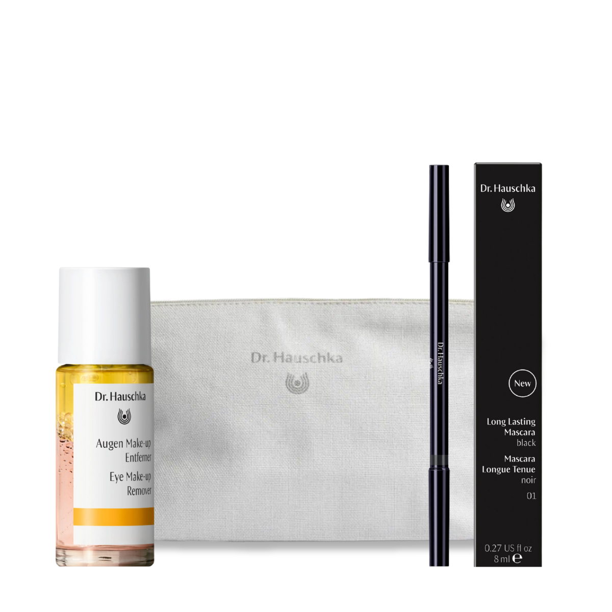 שלושה מוצרים איכותיים מבית ד״ר האושקה ליצירת מראה עיניים מוקפד: עיפרון מדויק, מסקרה עמידה לאורך זמן, ומסיר איפור עיניים.